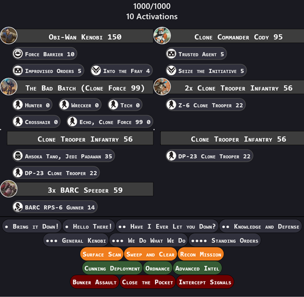 All 10 of these activations have a job to do. All four Clone Infantry units are kitted out with heavy weapons (and a Leader in the form of Ahsoka Tano, Jedi Padawan for one of the units), there would have been plenty of opportunities to roll dice against his opponents. Three BARC Speeders need a skillful and tactful hand. Getting the balance right of not overstretching them so that they get shot and die to a stiff breeze whilst, but keeping them useful and ready to jump on a POI when ready is not easy. Fortunately there are distractions in the list to take opponents’ focus away from the Speeders in the form of the Bad Batch, Obi-Wan and the Ahsoka Clone Infantry squad. The list would excel at the Close the Pocket and Intercept the Signals, with the former making up half of Coltan’s games at the event. With the Clone ball sticking together and trying to hold the double scoring centre POI on Close the Pocket, the BARCs and The Bad Batch can use their manoeuvrability to strike at the side POIs and at least contest them to stop the opponent scoring or hope to overload one to get a 2-point swing going each round. Obi-Wan provides a defensive reassurance to the token-sharing clones and Cody provides support to the BARCs through
