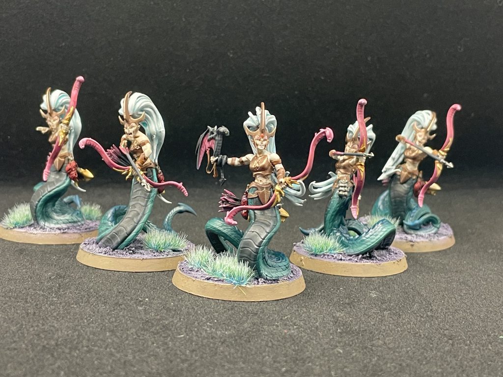The Blood Stalkers do solid covering fire to pick up chaff or heroes out in the open, and the Doomfire Warlocks are a very flexible unit. They are fast with 14" move, and as Wizards they can chuck Doomfire for damage, Mindrazor or Steed of Shadows to support a more forward Melusai unit or cast Endless Spells in a far more advantageous location than the Bloodwrack could.