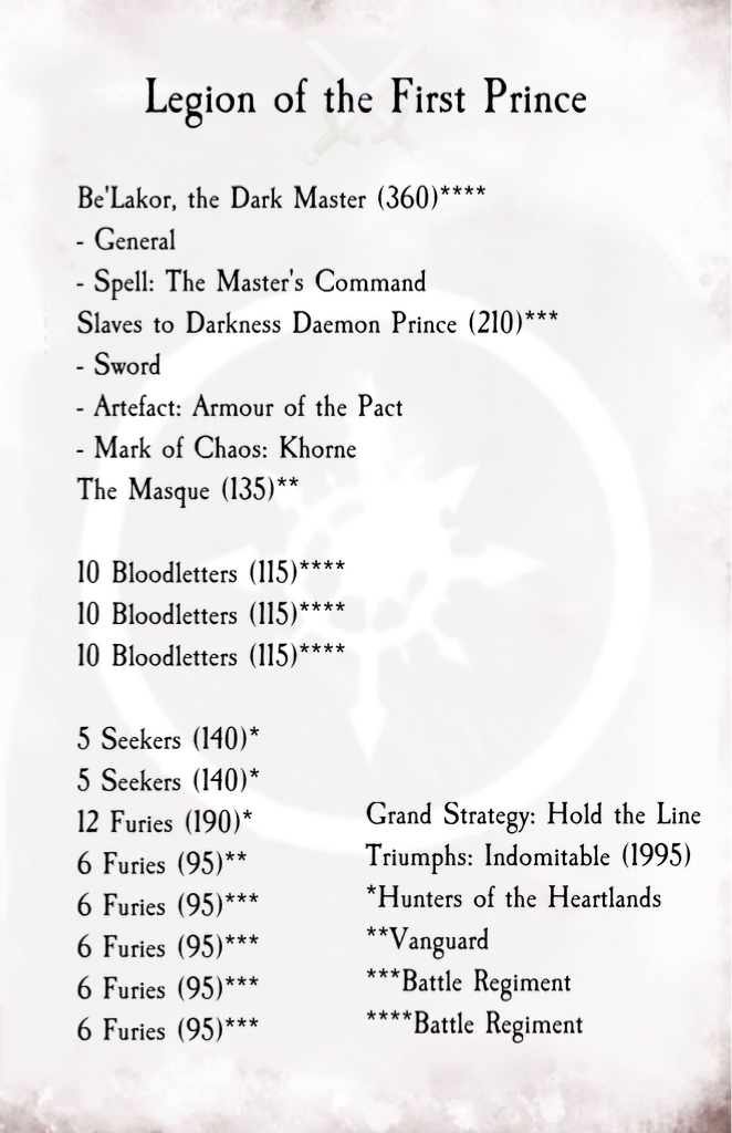 These three things together make a nightmare for your opponent when spammed, as they can basically act like a bunch of annoying gnats making it impossible for your opponent to get out of their deployment zone while the list quietly starts churning out Plaguebearers and/or Horrors every turn (or in fact more Furies!). The Khorne DP is here to pop down bloodslicked ground to make charges a ludicrous proposal for your opponent, and the whole thing just looks exhausting to play against.