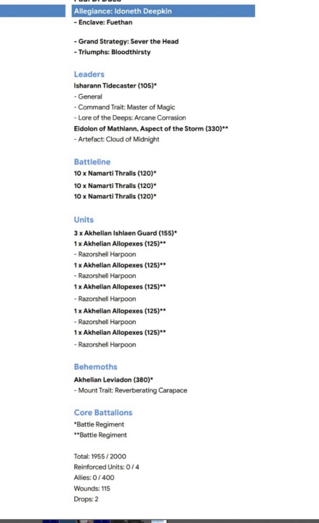Presumably this is because the Idoneth FAQ hasn't been released yet and the TO didn't want to make any rulings on behalf of GW. As for the list, it's about what you would expect from pre-battletome Idoneth: A bunch of sharks that benefit massively from the improved warscroll they received in Broken Realms, paired with an Eidolon to make them immune to shooting for one turn with Cloud of Midnight. It can hit hard and surgically but doesn't want to get bogged down in lengthy engagements.