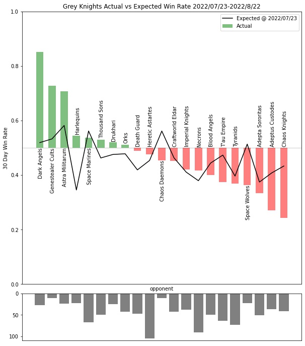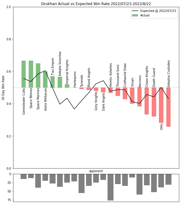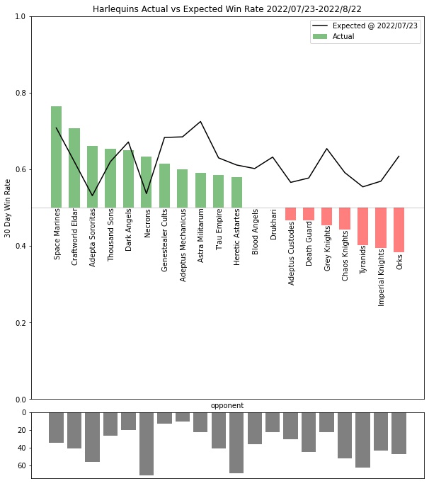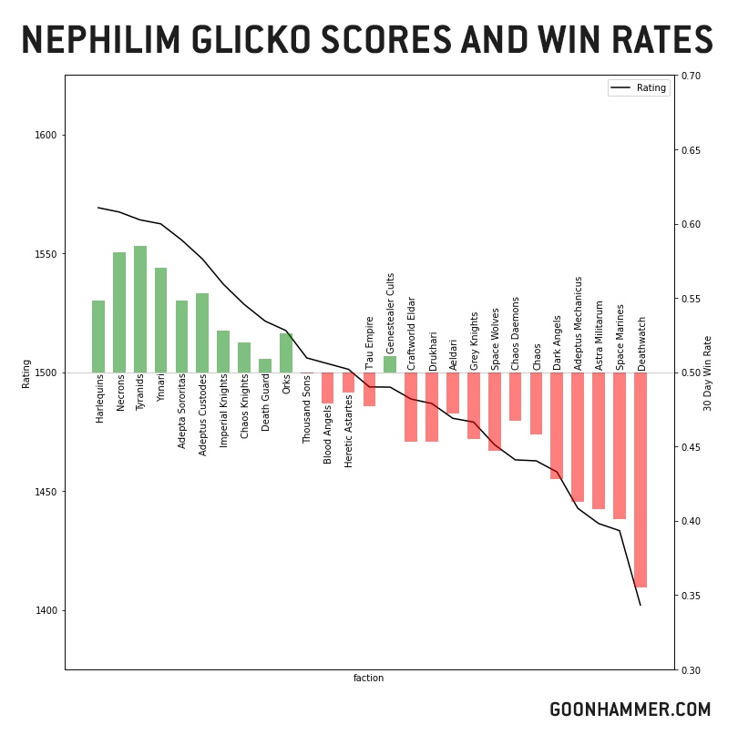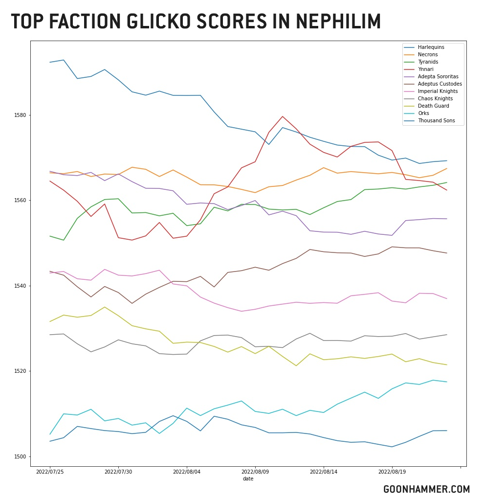 We've tracked Glicko scores before for 40k factions and in Nephilim they've shifted considerably, with Harlequins showing the biggest drops over the past month while the Sororitas have seen the biggest gains.