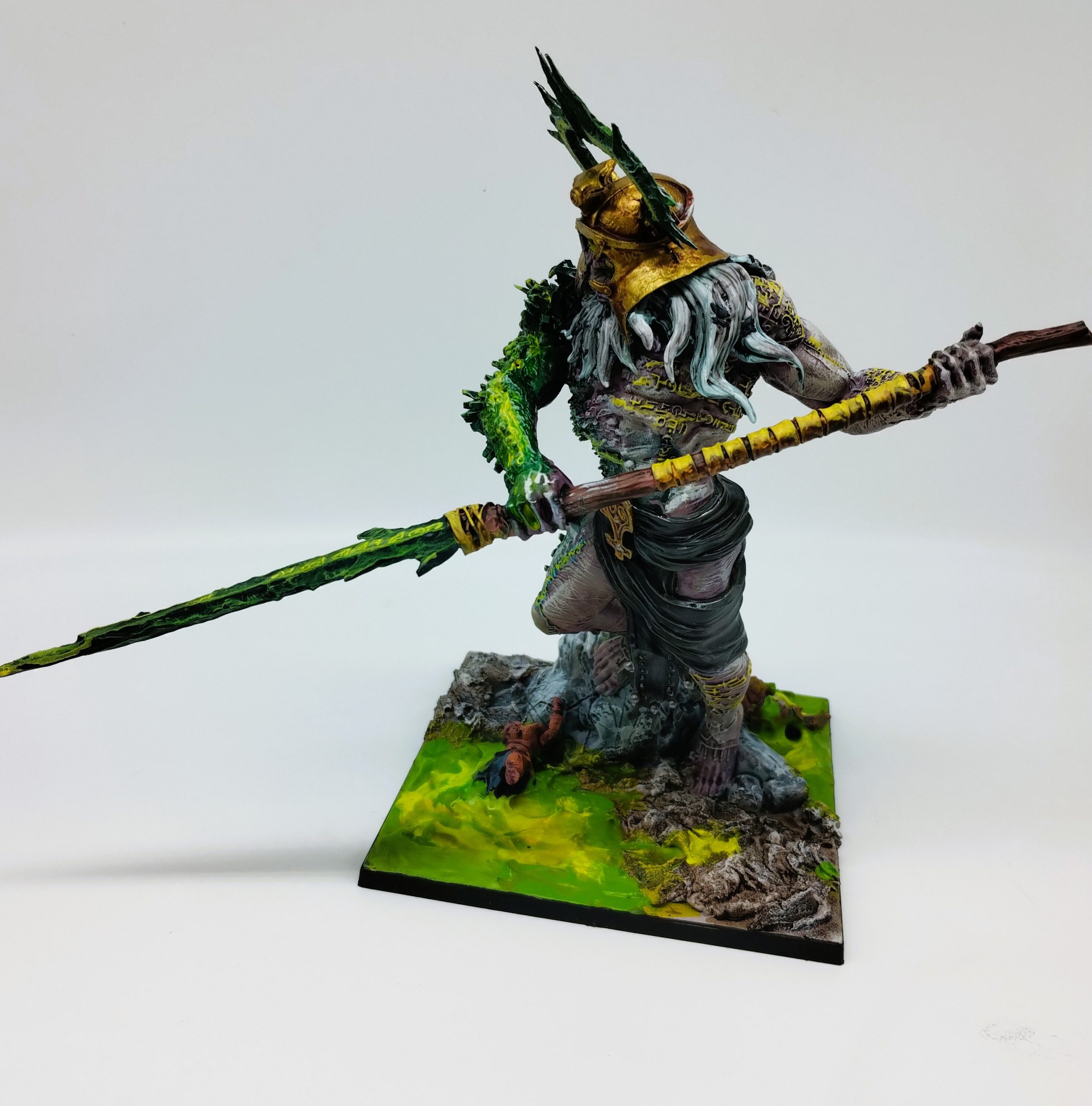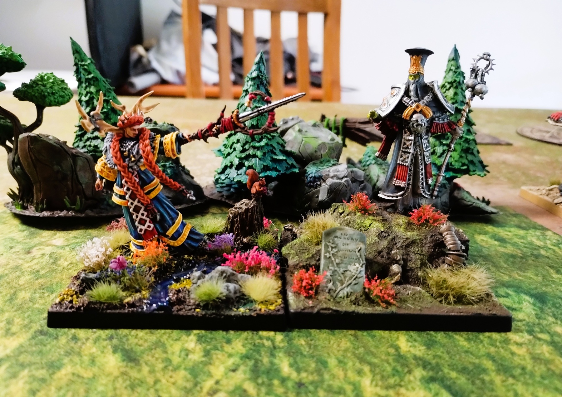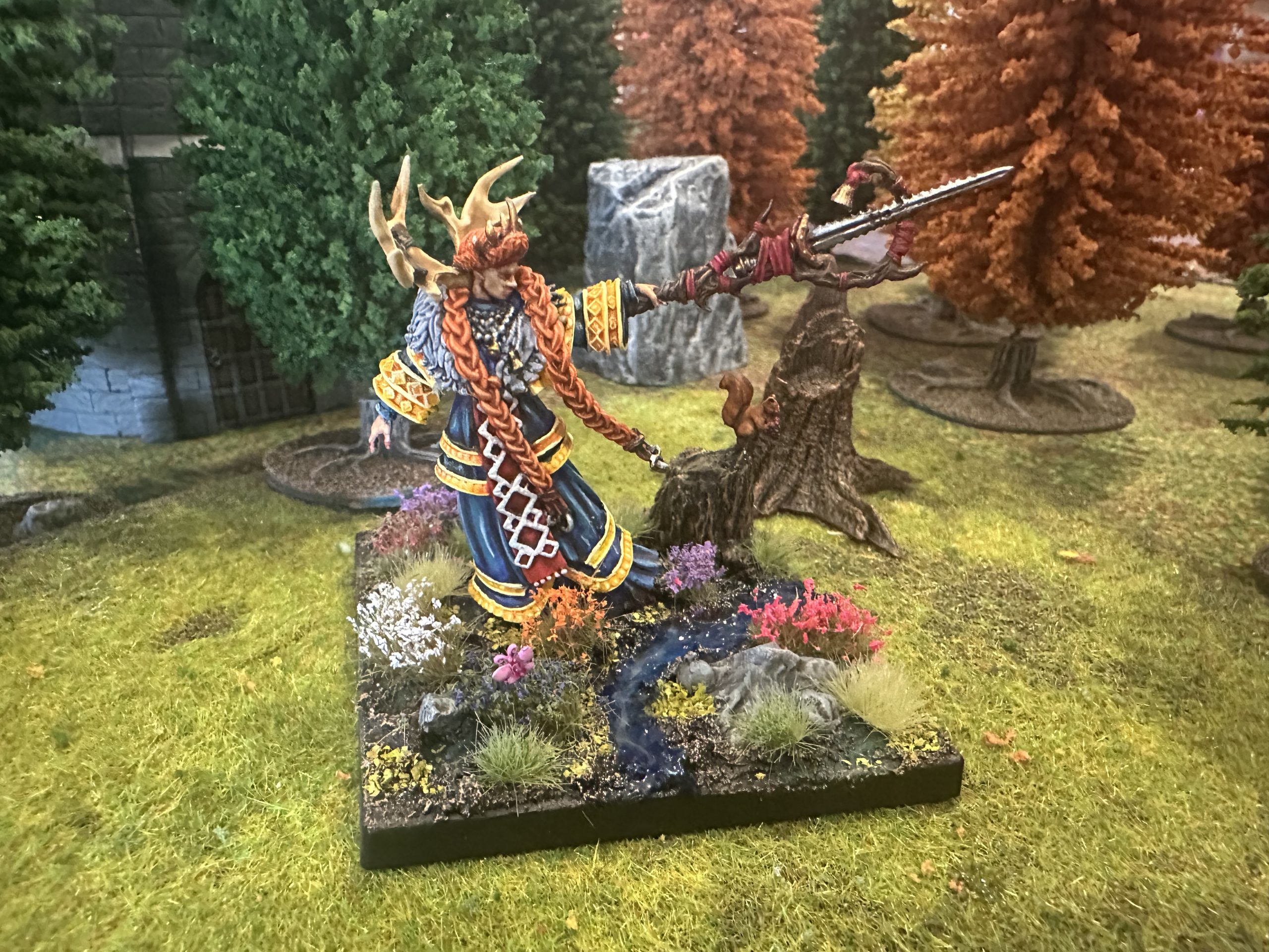 Adventurous headdresses aside, Reginlief is a rare model for me: an art project, rather than a game piece. Painting Reginlief let me explore building a little narrative with the model; her little squirrel friend holding a berry, the butterfly in the flowers, even down to her colours hinting where she comes from. Infantry characters in this game give us the opportunity to create dioramas that we so rarely take; my stylized desert Wadrhun are a prime example of prioritising getting something on the table above telling a story.