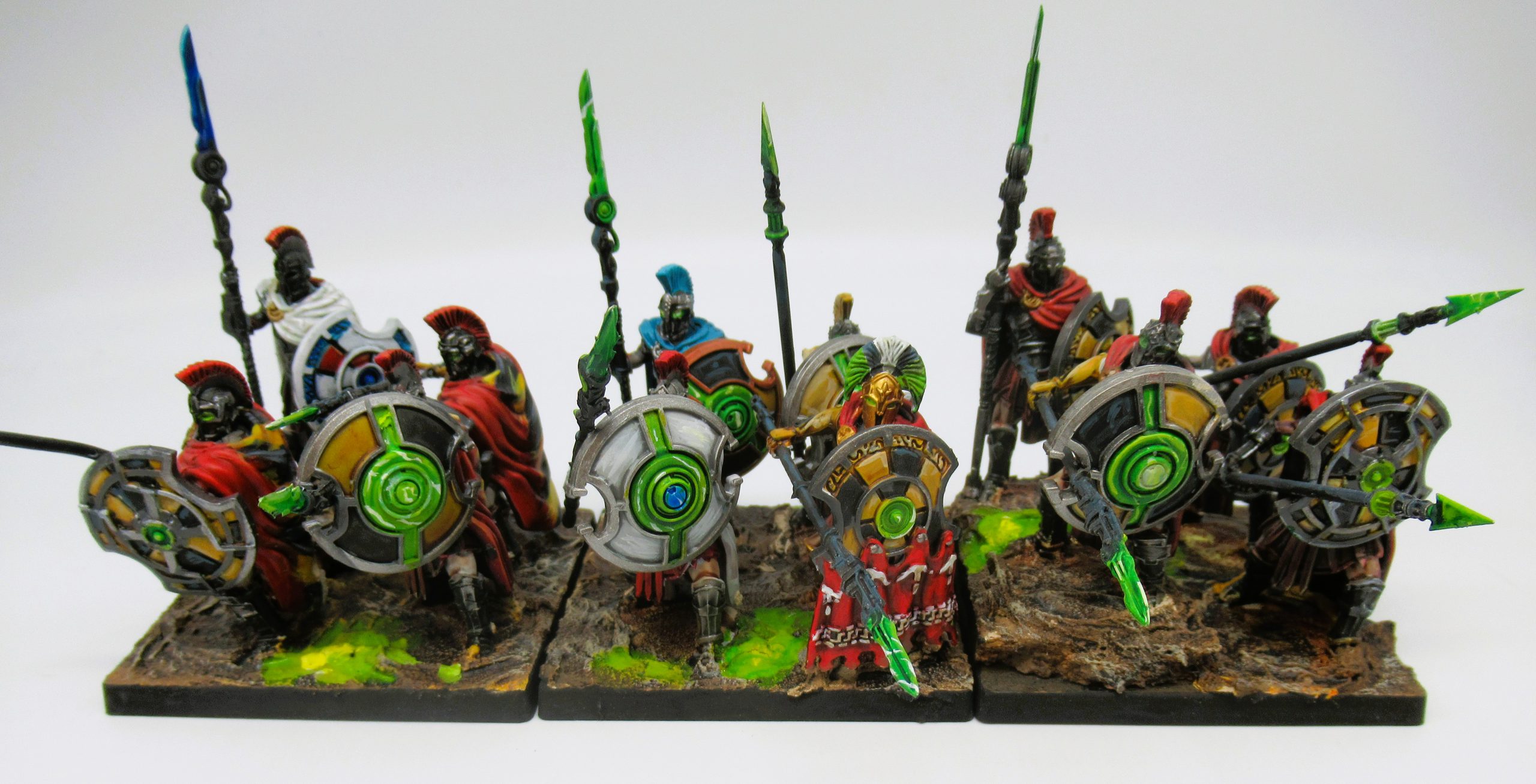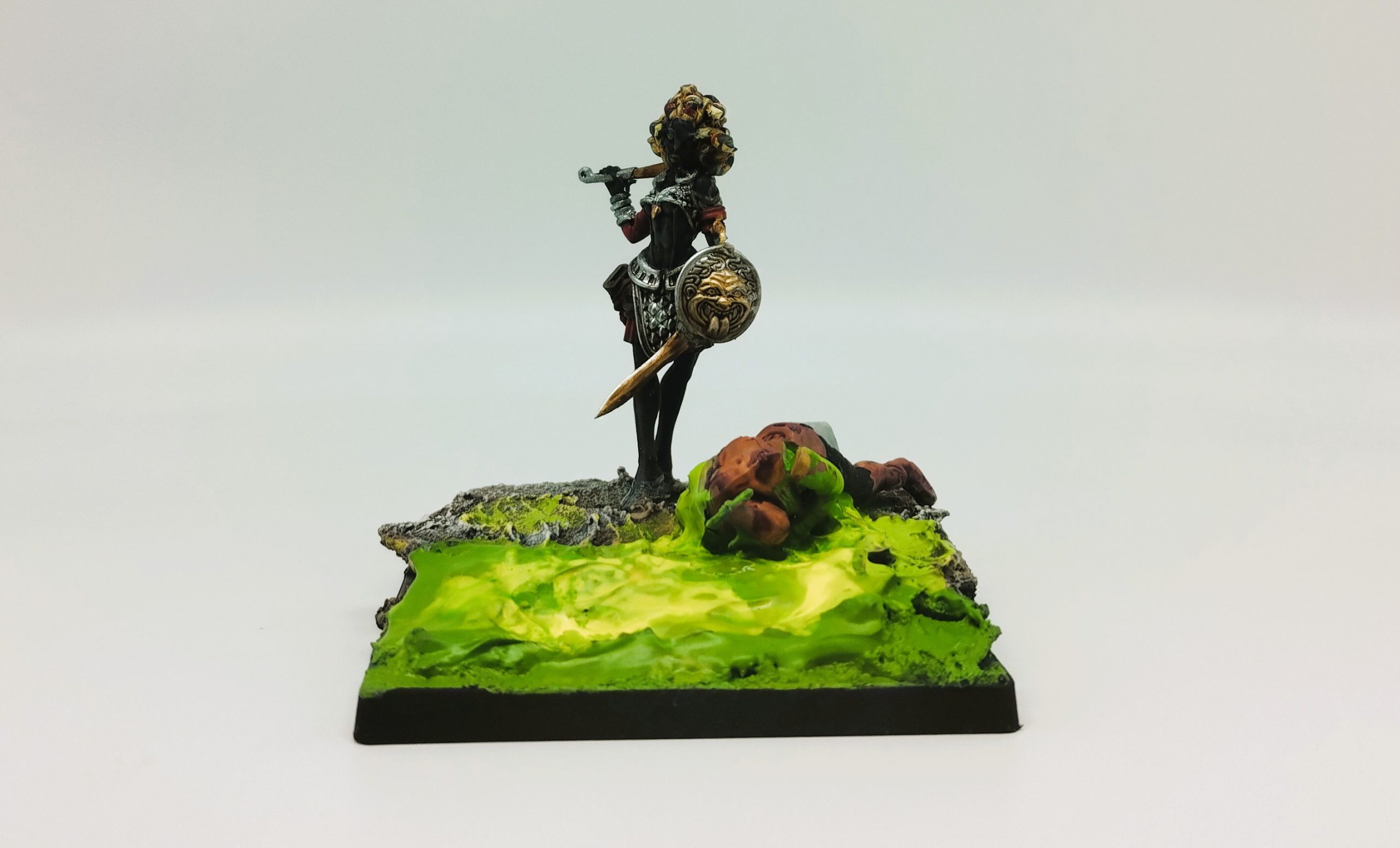 As far as the model herself goes, I can't help but get the impression she skipped leg day. She's got an absolutely ripped six pack but all of her limbs are extremely slender. It works for the effect, she feels kind of twisted and alien. Given her stance and light armour, though, she doesn't look at home amidst a unit of hoplites, though she'd fight right in with some Agema.