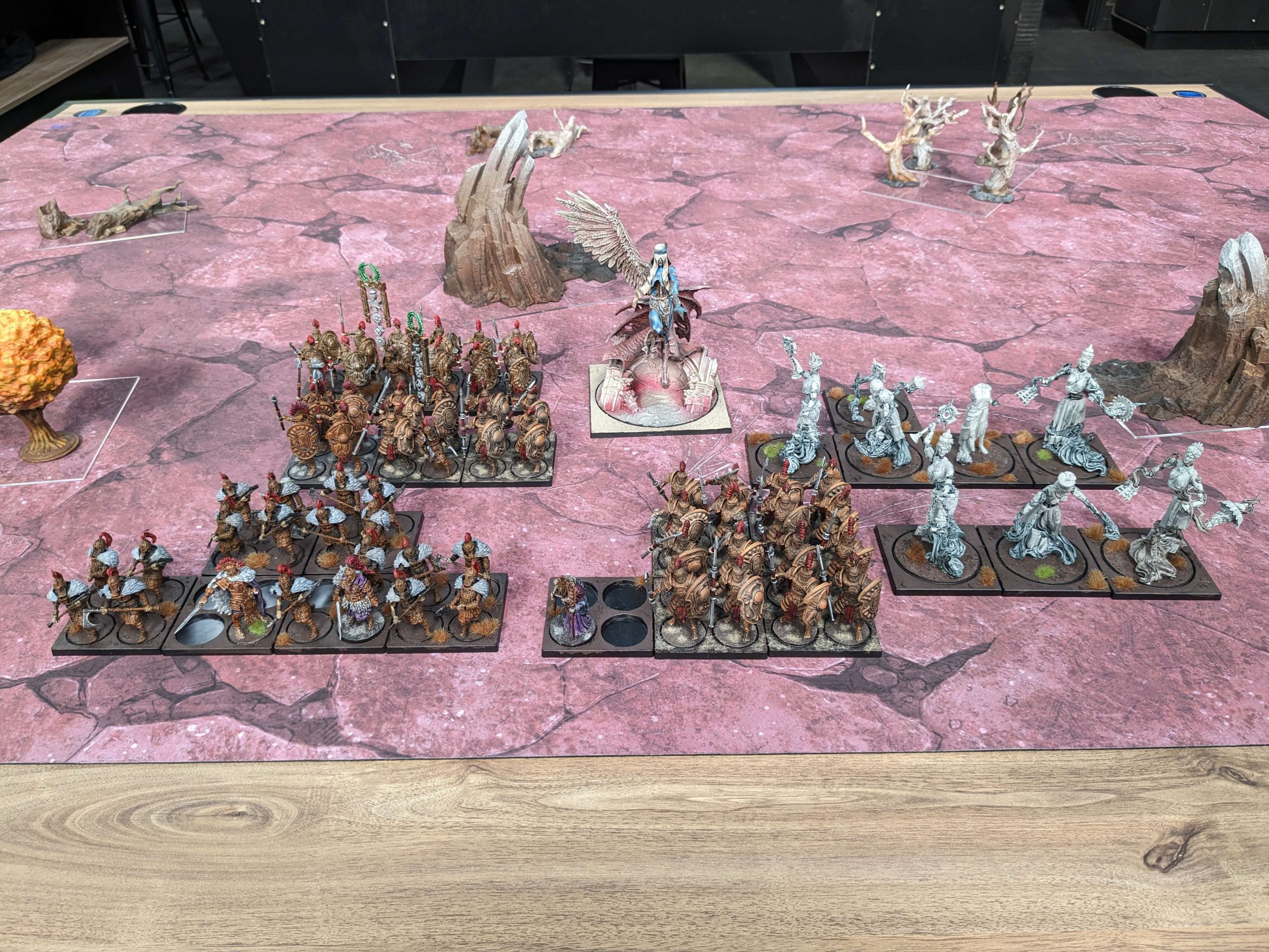 In game, there were a lot of memorable moments, mostly heroic opposition to my villainous Spires – in round three we saw a unit of Hoplites holding against attacks from the front and both flanks like the Spartans at Thermopylae, with no help on the way and no hope in sight. Game two let me introduce my Spires opponent to what happens when a lethal demise unit fights a lethal demise unit, and we even managed to wrap up the entire interaction without forgetting whose turn it was. And of course, Ben’s Fallen Divinity reaching tier three and sweeping across the battlefield like General Radahn’s descent, killing something like eight units and characters by herself over the course of the game.