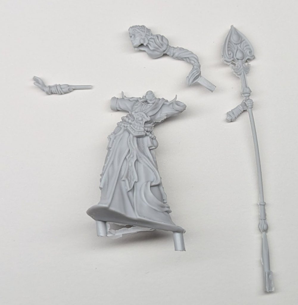Rich: I’d echo pretty much everything already said here. I had similar issues cleaning up and straightening the staff, which is just so narrow compared to the rest of the mini. I don’t want to focus on the minor negatives too much though, because just look at this sculpt! Everything is layered so beautifully, he feels ornate without being ostentatious, and overall really conveys the idea of a leader who is powerful not only magically, but politically. I’m looking forward to really trying to sell the idea of expensive, luxurious materials when I paint him up.