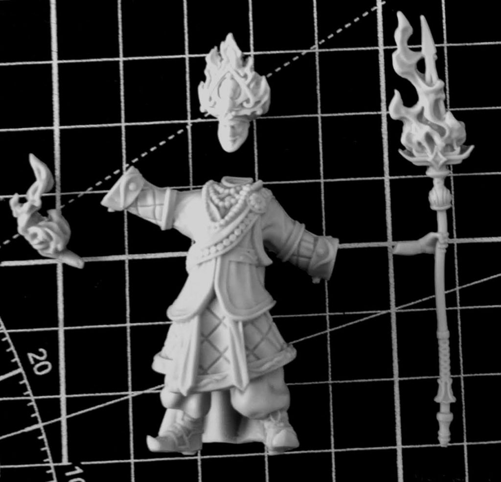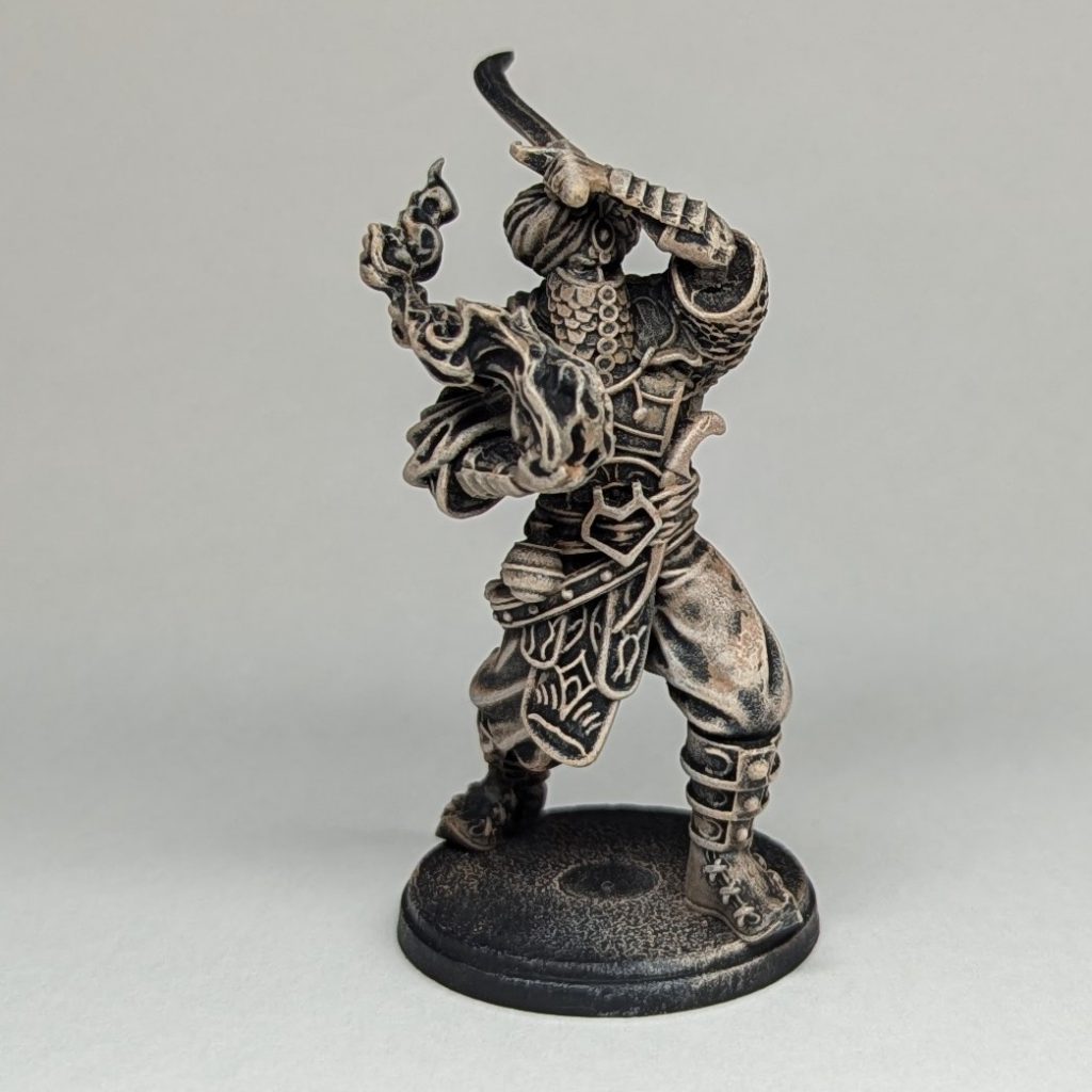 Musterkrux: Just look at those curves, those flowing robes. Wow. That’s not even a 3D render of the sculpt, that’s a straight up photo of the review model I received. Yum. I like a lot of elements of this model: The chainmail-veil, the over-head chopping motion of the scimitar (kilij?), as well as the direction/angle of the flames cradled in his hand.