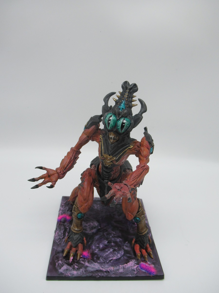 extremely tall. She's head and shoulders above a human mini and even taller next to a hunched-over Force Grown Drone. Giving her even more verticality as I did with this base makes her absolutely tower over her formation.