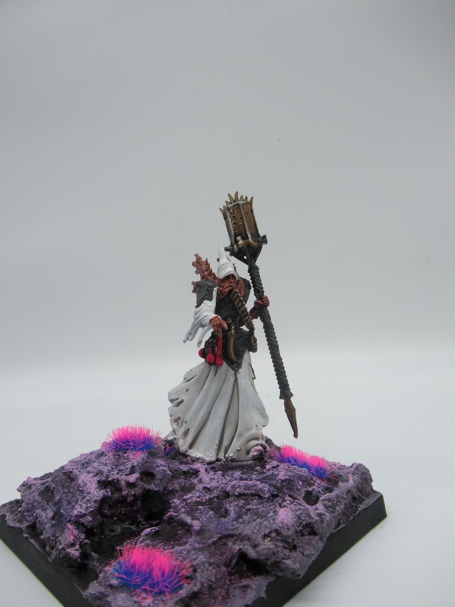 Painting wise, the big selling point is the two rounded bubbles above the metallic face. I chose to go with creepy eyes, which they're perfect for - a more patient painter than I could even do some sort of creepy compound eye pattern if they wanted. The ankle shackles have big, rounded orbs that can be painted as gemstones. The angle was a bit awkward to do that when it was glued onto the base so I settled for a contrast paint over silver rather than trying to blend it.