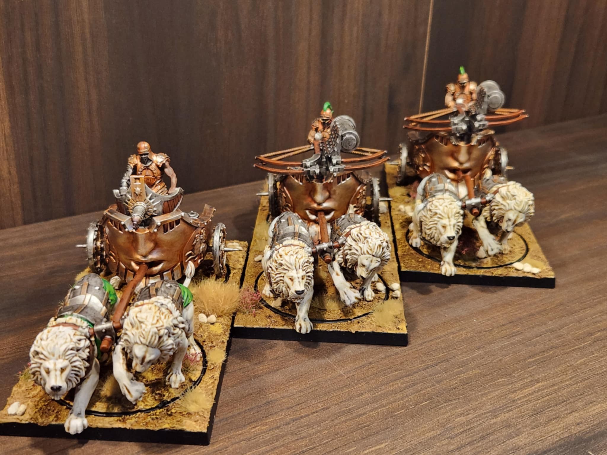 Build them with the flamethrowers. Not for mechanical effect - the Skorpios is entirely good, maybe even a little better than the flamethrower - but because the assembly of the crossbow is a pain and it doesn’t look nearly as good. The two firing modes are fairly comparable and if you’re taking multiple chariots you probably want both kinds.