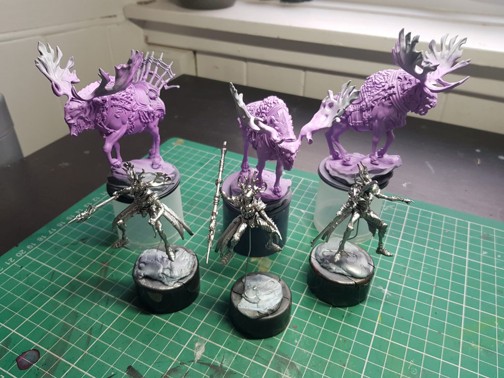 I wasn't sure if I wanted the meese to be icy blue or cold purple. Both felt very appropriate for northern rangers, but ultimately the latter felt like it would be more fun to paint and seem more ominous. I airbrushed the mounts with a mixture of FW Ink
