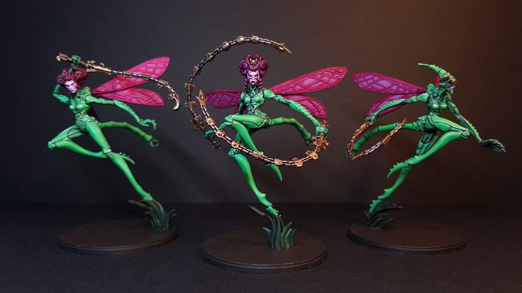 Three finished-ish Scaile Dancers. I'm not entirely happy with the wings, and I haven't based them yet because I'm waiting on some nice marshy foliage to arrive. Credit: Rachel/PB
