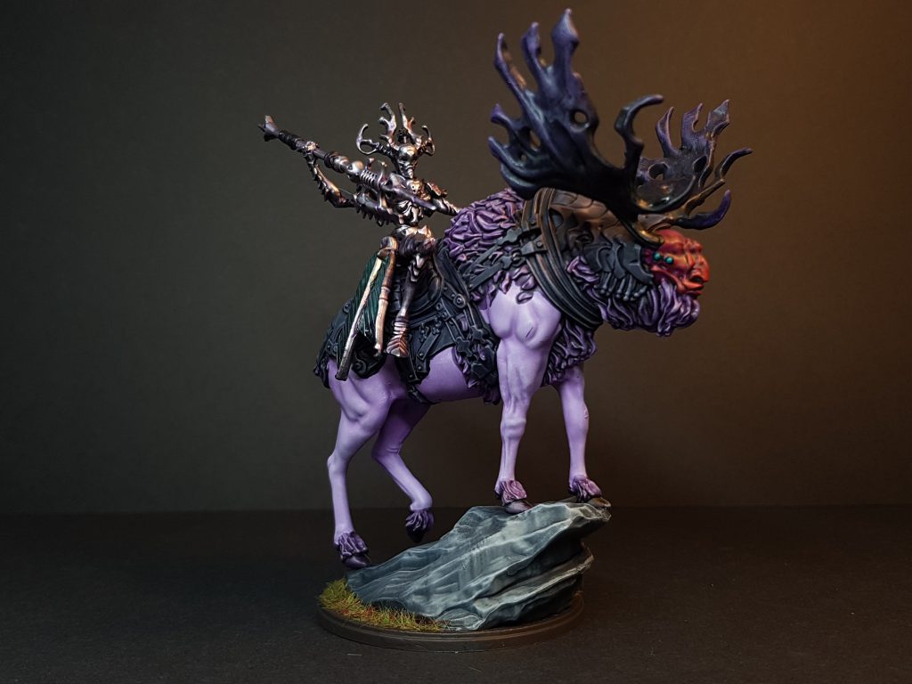 Shyish Purple, watered down a little, on the furry bits, and one of the reddish Contast paints (I don't remember which) on the face. I painted all the armour, tack and antlers in a mix of much darker purples and greys, using Contrast paints as much as I could, and finished off with a very light purple drybrush just to help things pop. I finished the face with some extra red highlights and painted the eyes with Contrast