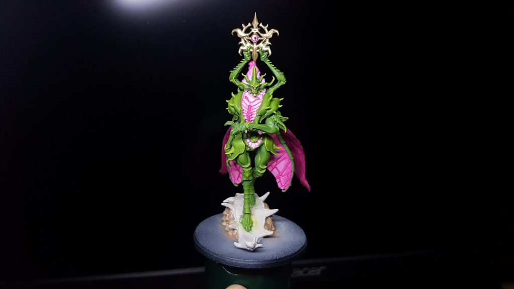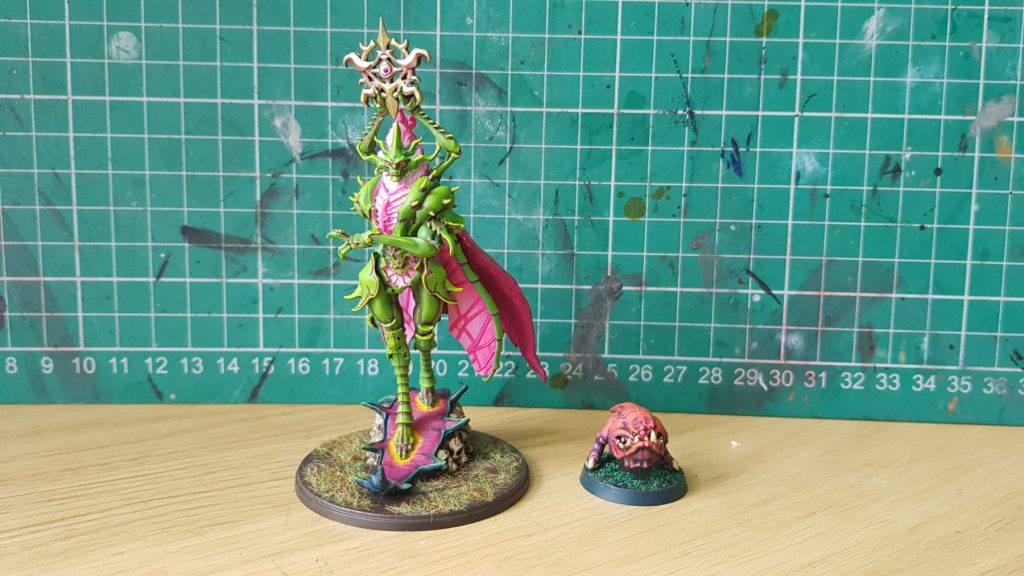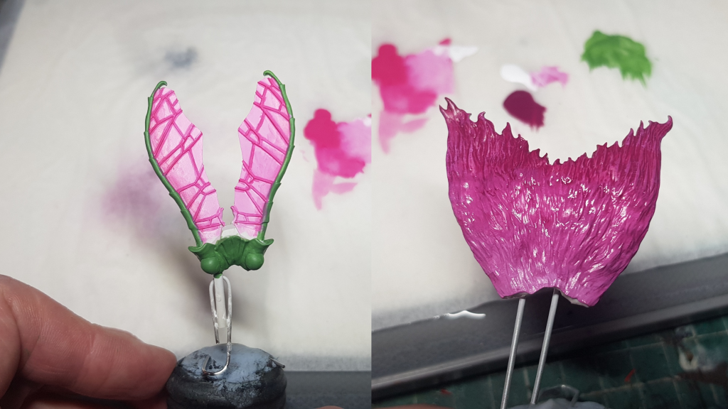 For the base, I stole the box art’s idea of having the plant-tongue-thing he’s stepping on be bioluminescent around his feet. I painted the rest Violet Red and the green bits