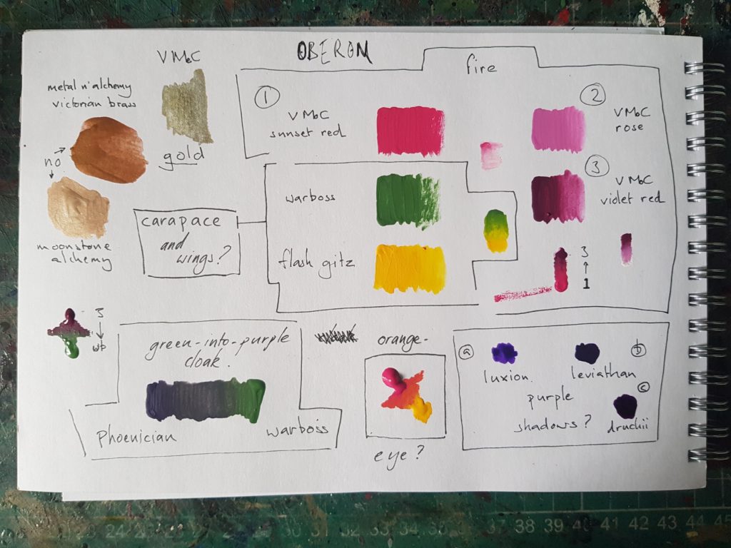 The box art for this guy is stunning but not the kind of thing I’d be tempted to replicate. Instead I set about scheming for something reasonably quick, simple and easy to read. I pondered plants, bugs, and other things in nature. I thought about fairies, in particular the old stories to which this Oberon owes his name, browsing through paintings of scenes from A Midsummer Night’s Dream and other fairytales. I looked at costume designs for the Shakespeare play. In some he wears black rags, in contrast to Queen Titania; in others he is among the most fantastically garbed of the cast. I was particularly taken by