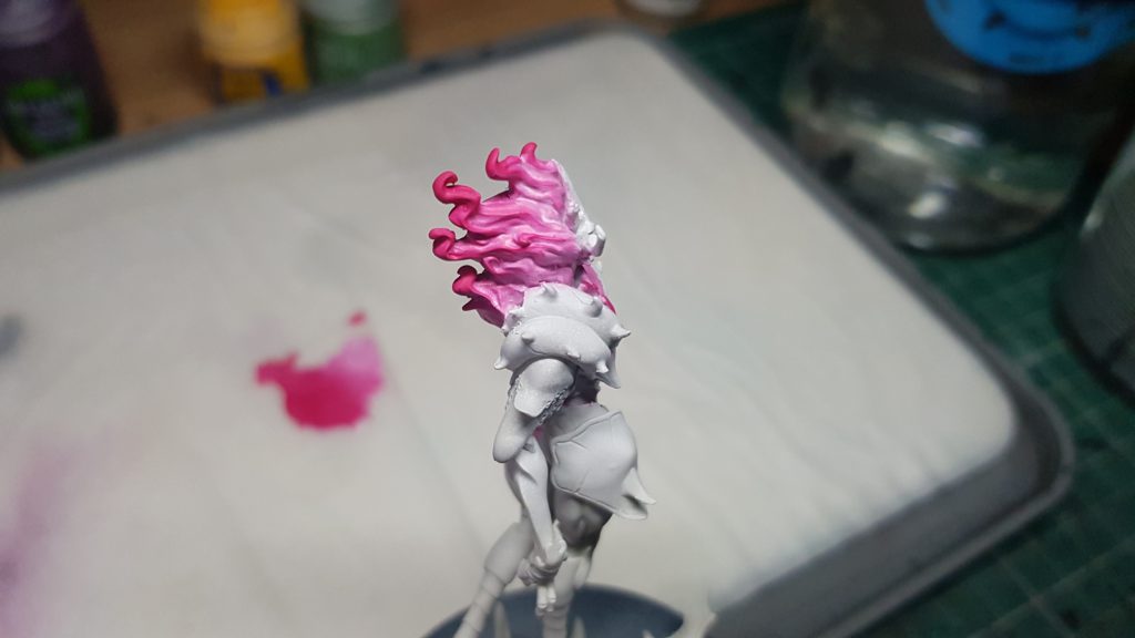 With the model assembled, I upped the contrast on the carapace by running Violet Red into the recesses. I should have used a better paint medium for this, as using water resulted in tide marks, most of which I couldn’t be bothered to clean up.