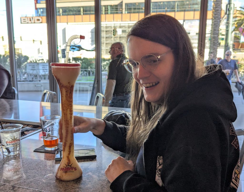 After that, Alice and went to the Aria to go to a pizza and beer joint that we both like. However, the place was apparently closed until 4:00 pm. However, we live in an Age of Wonder and Alice was able to find another pizza and alcohol joint that had 1) good pizza 2) the beer I was keen to get and 3) a giant frozen margarita that Alice could take with her to go