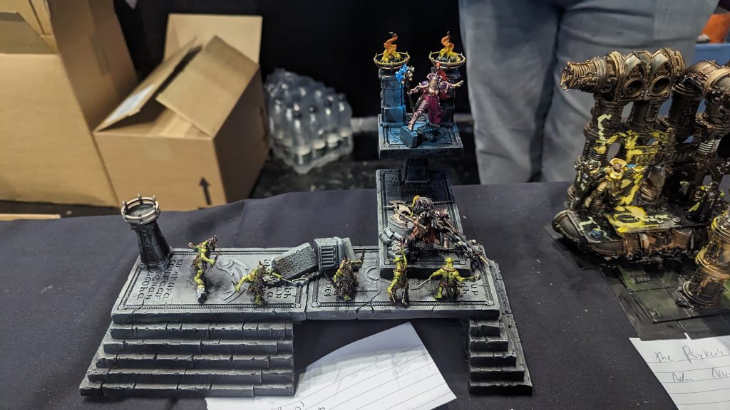 While I had my alarm set to wake me up at 5:00 am BST, I dismissed the alarm and went back to bed. I then woke back up at 7:45 am, which was less than ideal for trying to get into the 10th Edition Demo line. So instead, I went to participate in the hobby challenge as I had passes for both Saturday and Sunday. I selected the Age of Sigmar Chaos mini and began to build up a diorama. It was at this point that a hangover headache kicked in and I had not eaten that day. Nor did I have my usual supply of ibuprofen to stave it off. After about 6 hours, I decided my diorama was finished because I could no longer physically focus on the model.