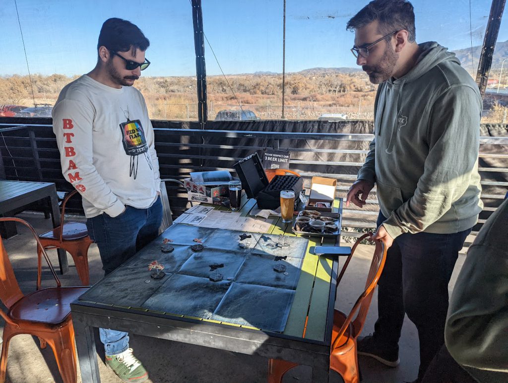 We eventually got the taxi, and took it to Bosque. Despite the chill, we sat out on the heated patio and ordered beer and lunch. Rocco took the opportunity to learn Aeronautica Imperialis, which he is detailing in his article. I took the opportunity to learn more about these new friends I've met (as well as Scott and Katie Horas, who arrived about 20 minutes after the rest of us did). After awhile, we all pick up lots of six packs and head back to the hotel.