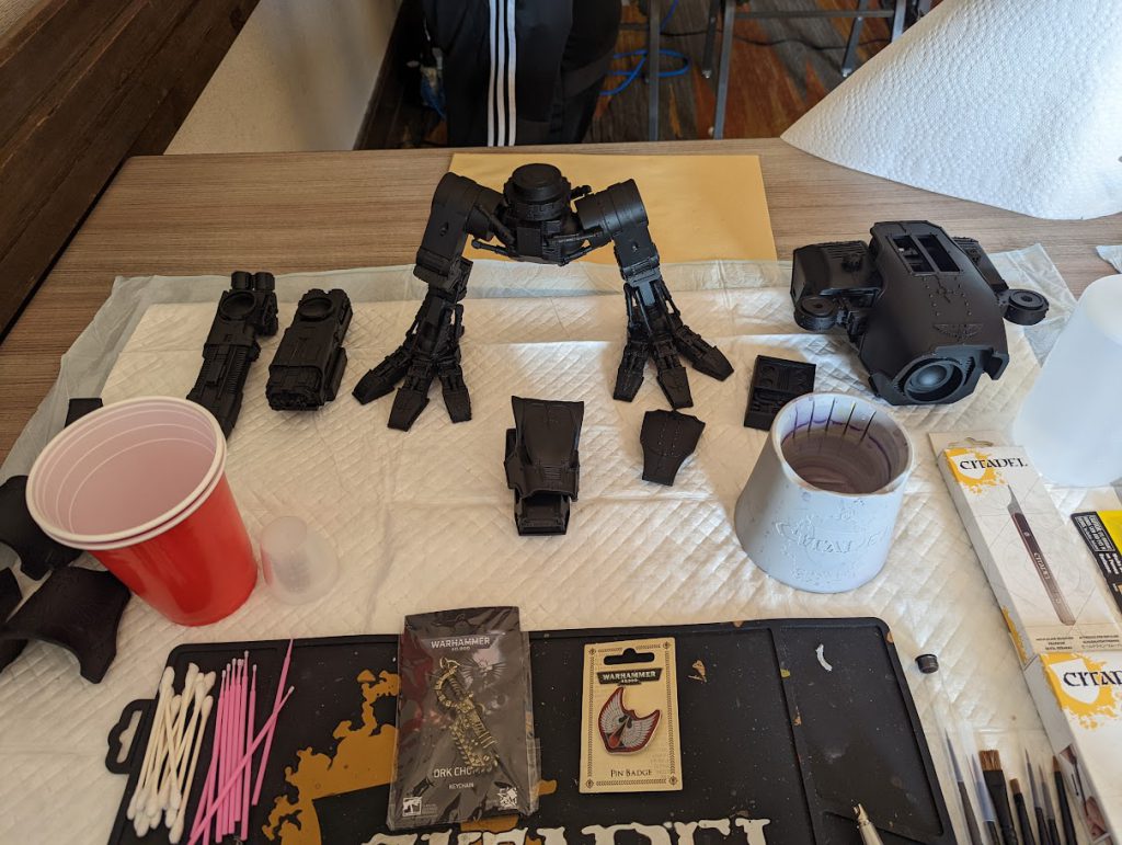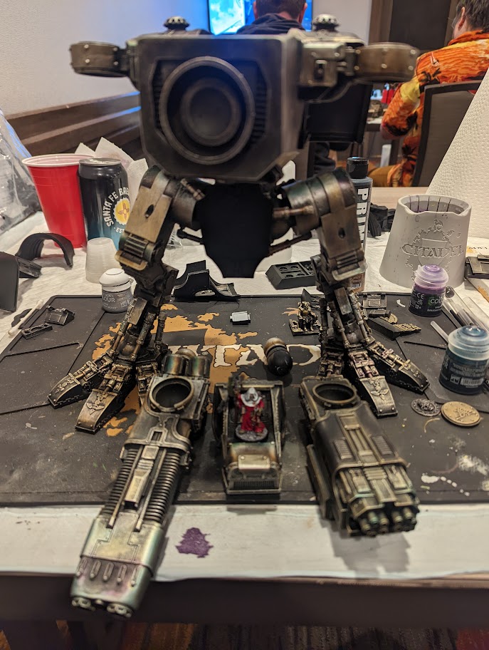 Day one would consist of painting the metallic understructure of the Titan. While not the most complicated element of Titan-painting, it was important because there was a lot of Titan to paint. The idea was, like with the Chaos Knight painting class, to make the metallics look more interesting than spraying them leadbelcher, washing them with Nuln Oil, and then drybrushing some silver on them. So we used the airbrush to make the metallics look more tarnished, used, and stressed. And then ultimately bringing them together with metallic drybrushing. It was a simple process, but time-consuming. During this period, I was also able to go out and take some pictures of my friend's games.