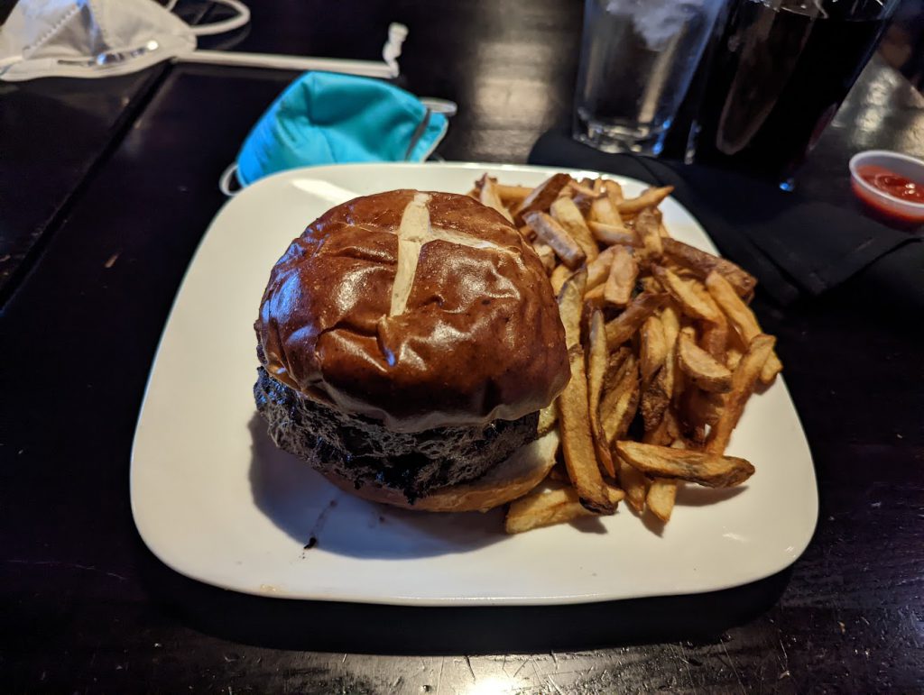 Kuma's has leaned into Adepticon *hard* by creating drink and food specials: They offer a drink called the Blood Angel, which is a Vodka mixed with Code Red Mountain Dew and some other stuff. They also offer an "Adepti-Burger", which is a burger topped with a chicken tender, Doritos, fried pickles, and some sort of dorito-based sauce. Along with a Mountain Dew Aioli. Kuma's also has two sets of exclusive dice - a set of 6 blue Kuma's dice available for purchase, and 2 smoky gray dice available only with the purchase of the Adepti-burger. The majority of the table opted for the Adepti-burger, though I asked for them to leave off everything except the chicken tender. I've always wanted to try a Kuma's chicken tender, but never had due to the fact I was always getting burgers. It was OK - chicken tenders are going to be more of an LVO thing anyway. What is excellent is the burger, and what is amazing is the new friendships made over breaking bread.