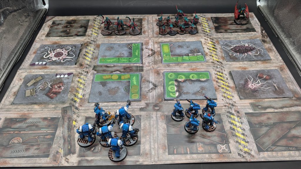 The gaming scenario here is Scenario 11: Battle Lines. While the Tyranid and Space Marine deployment zones are empty of terrain, the eight middle rectangles all have terrain cards. The Tyranid terrain cards are on the sides, while the L-Shaped Ruin cards go in the middle. It's 10 Termagants, 3 Von Ryan's Leapers, and 1 Tyranid Prime versus 5 Infernus Marines, 5 Terminators, and 1 Librarian in Terminator Armour. In this mission Space Marines can deep strike everything, while only the Tyranid Prime can deep strike for the 'Nids. The Tyranids go first.