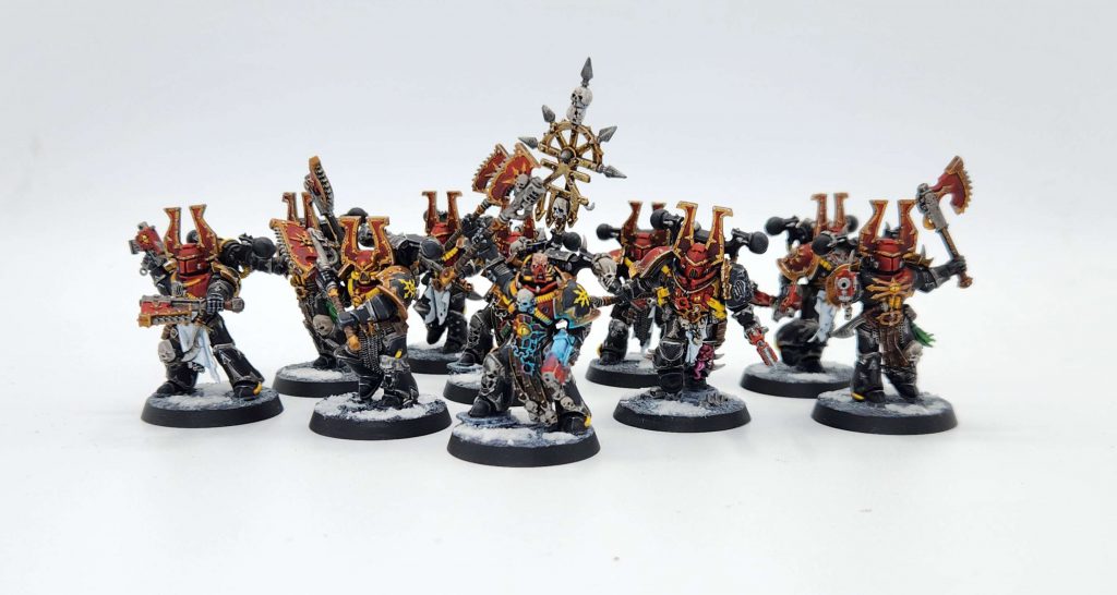 The main Black Legion heroes, Horus, Abaddon the Despoiler and Haarken Worldclaimer are all name-checked. We get pictures of the Black Legionaries using Legionaries but also all four cult troops: Plague Marines, Khorne Berzerkers, Rubric Marines, and Noise Marines. This narrative call-out is pretty cool, because it gives us an alternate color scheme for one of the Combat Patrols coming down the bike (the World Eaters Combat Patrol) and a lore reason to do it that way.