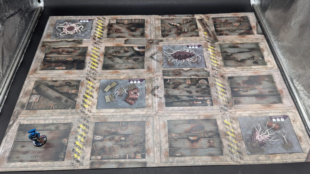 This mission pits one Infernus Marine against the four Tyranid Terrain Battlefield Cards. Each of these Terrain features has a different toughness and save, and the Infernus Marine has to destroy them all before the spores used by the terrain feature kill the Infernus Marine. I decided to play out the scenario.