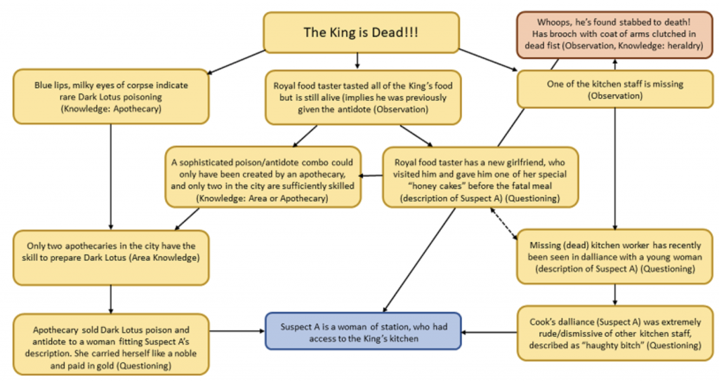 Ilor: One way to help you organize your mystery is to create a “clue web” for yourself. That is, for each clue or piece of information the players find, have some sense of where it might lead them, and that in turn may lead elsewhere. But importantly, try to make sure that there are at least two ways to get from one point to another. For example, let’s say that the King has been poisoned and we want to give the players some clues as to who may have been responsible. That might give us a clue web like this: