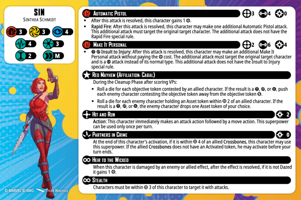 To say Sin is much maligned in Crisis Protocol as both a character and a leader would, I think, be an understatement. I’ve included her card for reference. At first glance, her stat line is very unremarkable except for a slightly higher than average Mystic Defense of 4, and really low Stamina pool on her healthy side, which is also 4. She does have 6 Stamina on her injured side, but for comparison, Rocket Raccoon has 3 Stamina. Her power economy also seems a little inefficient with only a gainer as a method to build power outside of taking damage, and a Reactive Superpower that only works with the original version of Crossbones, who has also been a much-maligned model for most of his existence. BarBarJonks is not new to miniature wargaming and has played competitive MCP since 2023, so I knew there had to be a reason Sin was chosen as the leader.