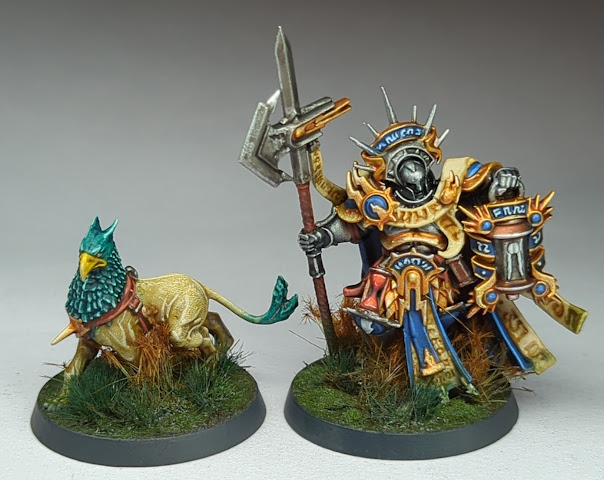 Later in December I fell prey to Flesh-Eater Courts hype and painted up this Abhorrent Arch-Regent in a vaguely Morgaunt-inspired scheme. I wasn’t going to immediately turn this into an army project, although I did buy the Warcry warband, but I was very lucky to get the new army box as a Christmas gift and so now I’m definitely going to have at least a small army in the new year. Finally for myself this month, I painted up a Knight-Judicator and their Gryph-hounds, and did a bit of a headswap to give them a bare head. I really love this model, it’s one of my favourites of the new Stormcast, and I was glad to finally get hold of it via Stormbringer magazine and paint them up.