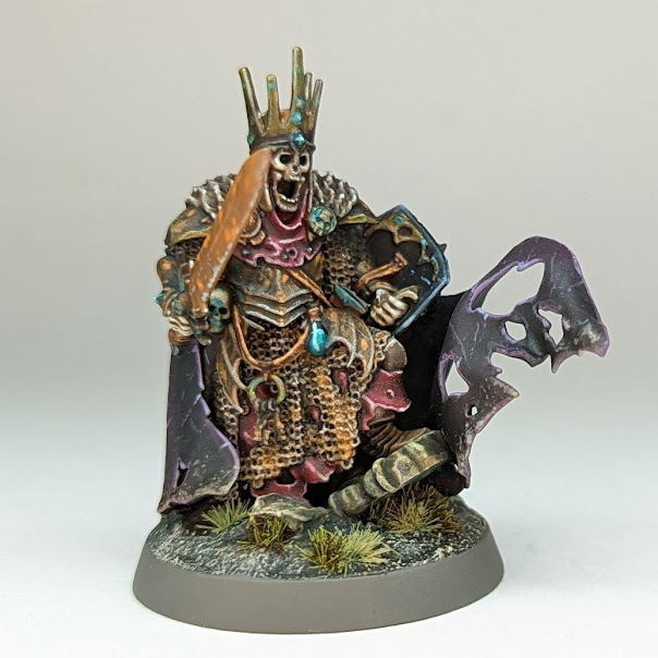 Having failed to get the diorama looking how I wanted, and with time before the event running low, I decided on a somewhat more modest approach - pick a single AoS miniature, and just focus on painting it to the best of my ability. I opted for the Wight King, as it’s a mini I’ve always loved and never painted, and would also be able to use after the fact in my nascent Soulblight army. I poured a lot of hours into it over a few weeks (with a quick pause to paint a couple of MESBG dwarves), and honestly I’m still thrilled with the standard I achieved.