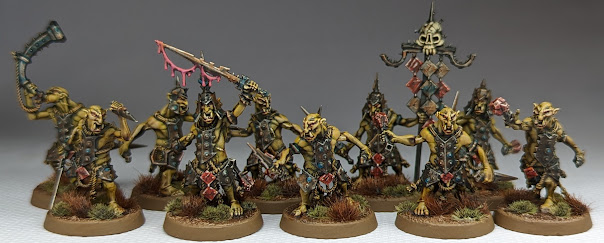 I started painting a lot more Kruleboyz in July - I settled on an underpainted plus highlights method which (in my opinion) gives a decent result for the amount of time invested, and has rapidly become my go-to method for army painting. This month I finished 10 Gutrippaz, 6 Bolt-Boyz, 10 Hobgrot Slittaz, and a Snatcha-boss on Sludgeraker Beast.