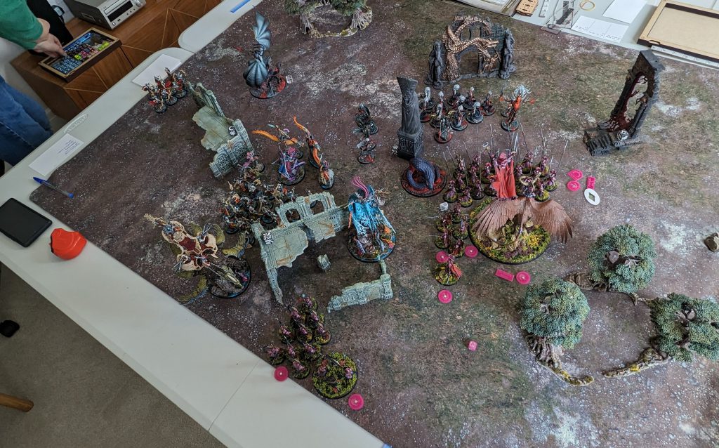 I did get a couple of fun games in this month though. With the end of third edition AoS on the horizon, I got together with pod co-host Matthew and pod sometimes-guest Chris for a three-way game of Triumph and Treachery, the multiplayer game mode from one of the campaign books. My Lumineth, Matthew's Idoneth, and Chris' Daughters of Khaine all stood in a triangle, pointing at each other. Looks like we got ourselves a good ol' fashioned elf-off.