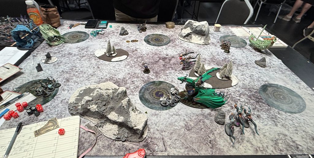 Julia had 4 casts in this army, and in turn 1 absolutely none of her spells succeeded. Gutting, as this really limited her ability to reach out and strike with Durthu or the Kurnoth. She moved her Gossamids onto the central objective, and plinked a few wounds off of the Stardrake.