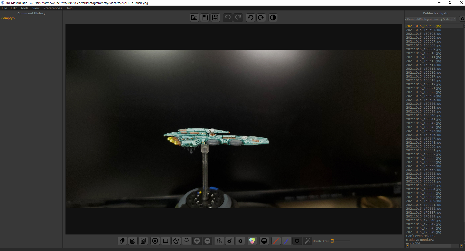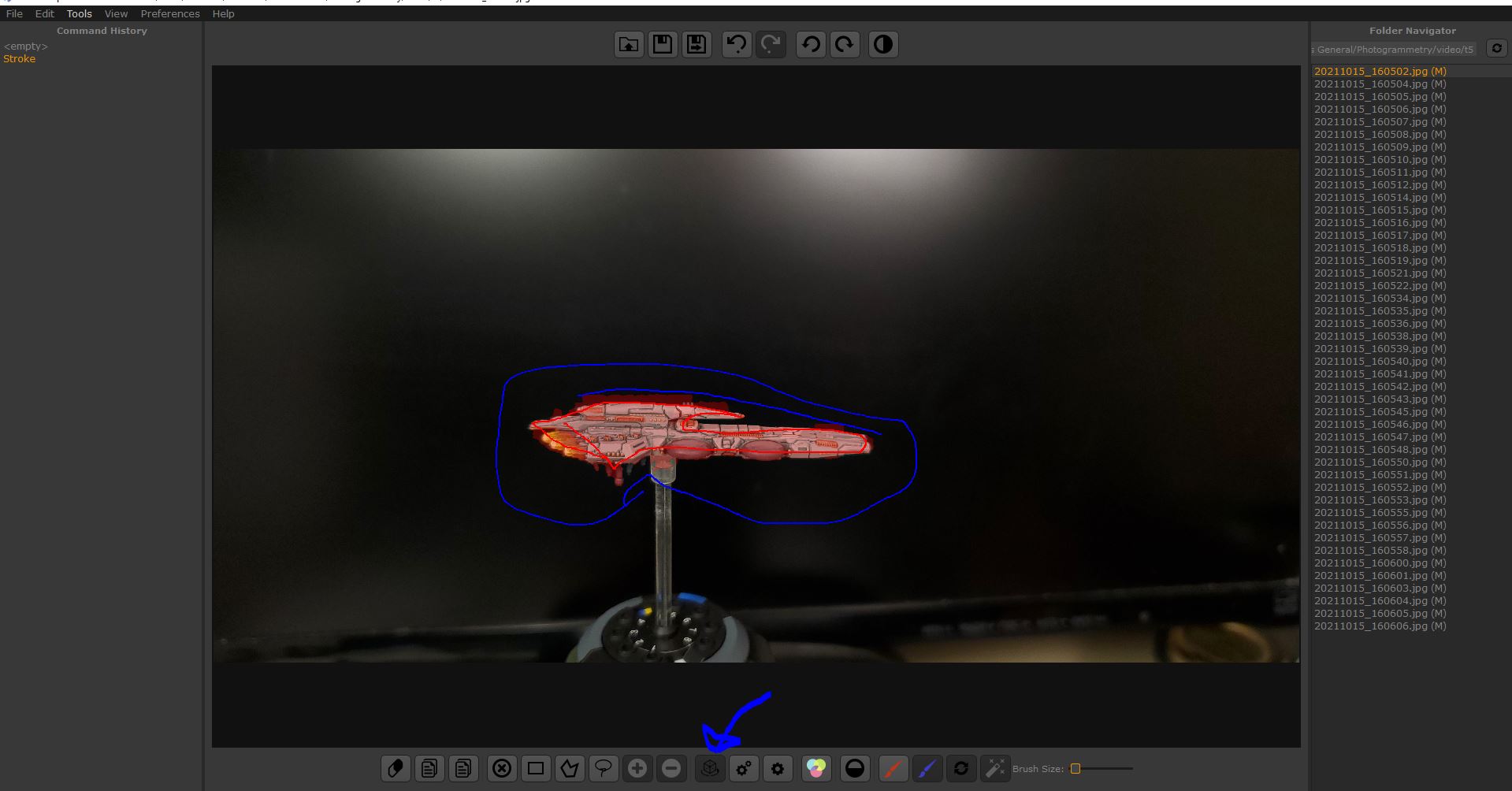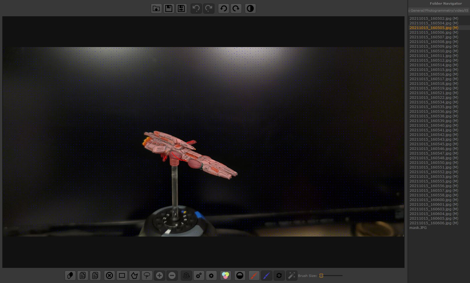 You will see that its actually pretty good at figuring out the foreground object, fortunately you don't even need to do this for every picture as it can auto compute them. The gear button or "enter" saves, advances to the next picture, and begins to calculate a approximate mask. Its pretty crucial to hit the turntable mode button I have pointed to, as it optimizes the algorithm towards sequential images.