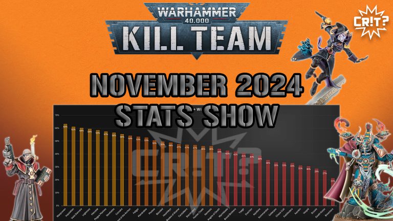 John from Can You Roll a Crit? is back again with his monthly stats show for Kill Team! With a full month of the new edition worth of data, he covers how the game performed globally at tournaments! Watch on to see how the stats have developed from last month, along with a look at quarterly data too!