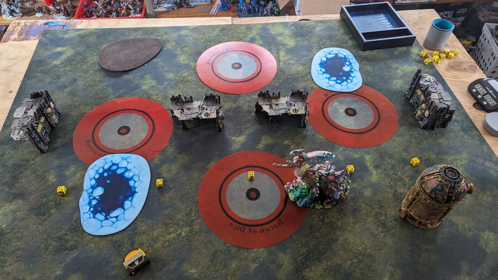 interesting as he is only six and has better things to do than “do something boring” like read the Warhammer 40,000 book. However, before almost every game I pack for he asks if I’m going to be taking his space marines and we’ve had more than one epic battle at home. Last year when we had an epic battle we limited our implements of war to models and terrain on a board. In the past 12 months we’ve started rolling dice and using a tape measure to move models. Admittedly the results of the dice don’t always correspond to the an outcome that a mini gamer would expect and the tape measure is being used in a new in an innovative way that likely has not been seen before in the history of games. I can't wait to get his opinions on standing on circles.