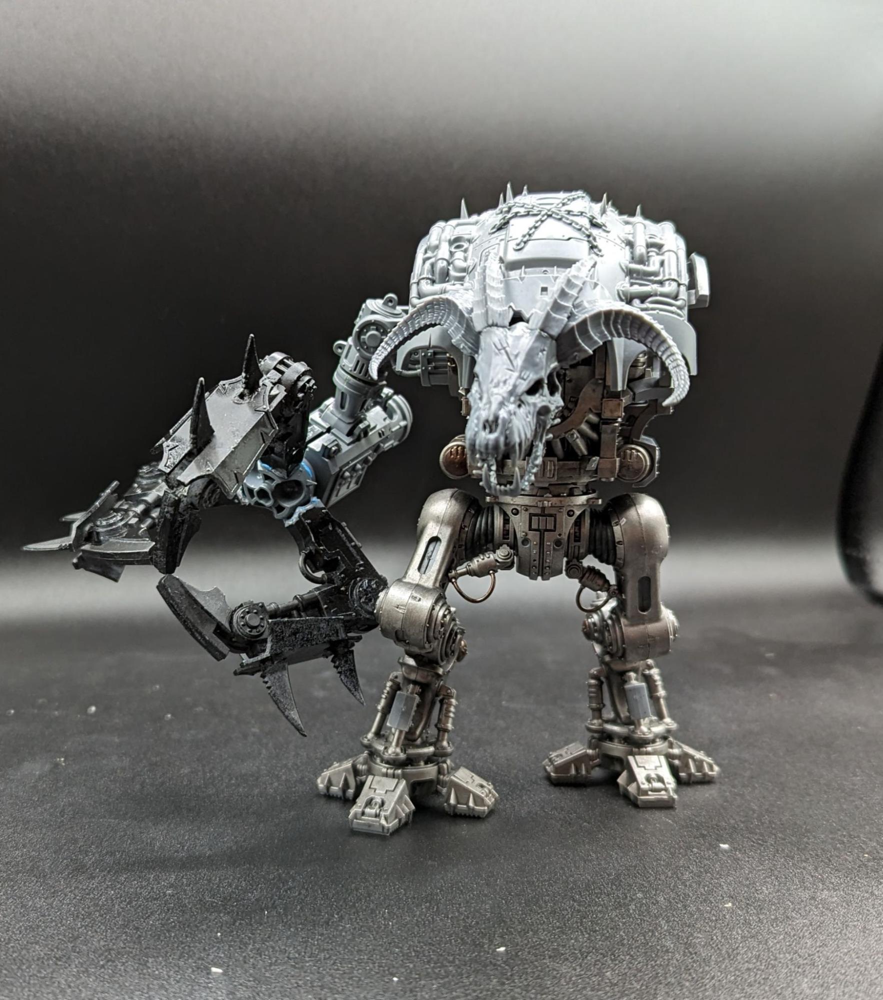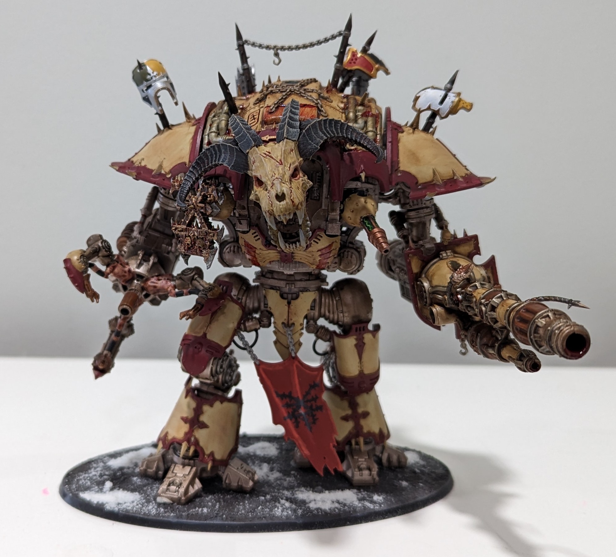 Regardless of your inspiration, it will lead you to thinking about what the finished knight should look like. This is, unironically, the most important part of the process. It will inform the themes you want to work towards and will focus you down and away from the blank canvas problem. I started with just “Khorne” and “World Eaters Ally” as my themes. These are pretty broad so I started thinking about what I wanted to try. I had done a skull themed knight a while back, and what else is left in the Khorne design space? Blood, of course!