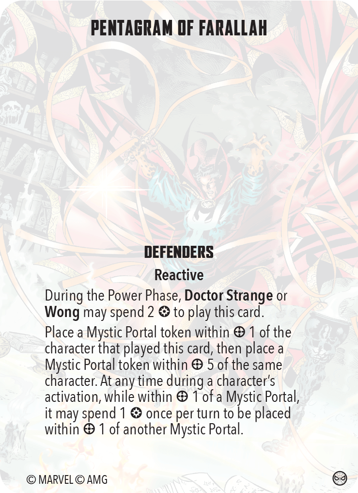 The original Defenders card, Pentagrams allows Dr. Strange (not the Sorcerer Supreme) or Wong may place two tokens that allows for three power that allows any model (enemies included) to teleport between the two for a cost of one power.