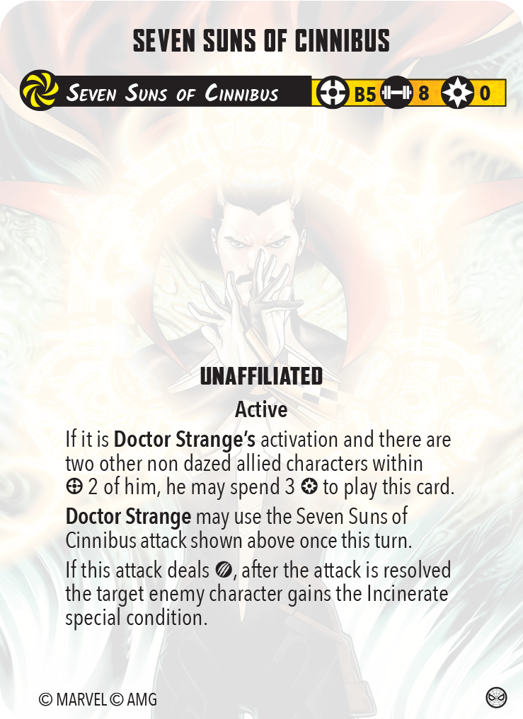 Essentially this means that once per turn, when attacking, an allied character (including Dr. Strange) can apply the hex condition to the target of an attack if damage is dealt or if the model is five threat or higher. Littering the opposing team with hex and denying their ability to get the extra dice from critical results is a notable turn in the math on a high threat character’s ability to spike. It doesn’t mean that Thanos or Hulk suddenly lose efficacy, but it can slow their roll a little.