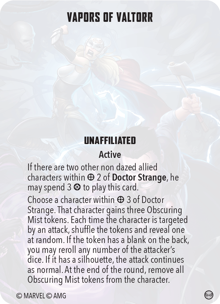 The effect is very powerful. We’ve all seen the Amazing Spider-Man knock off a trigger or shrug off that attack that was finally going to do damage to him with Witty Banter. This is the same effect but for any number of attack dice. If you want a model to survive the round, Vapors is one of the more effective ways to do it. Now that so many non-character specific cards have been rotated out, maybe it’s time to dust off Vapors again?