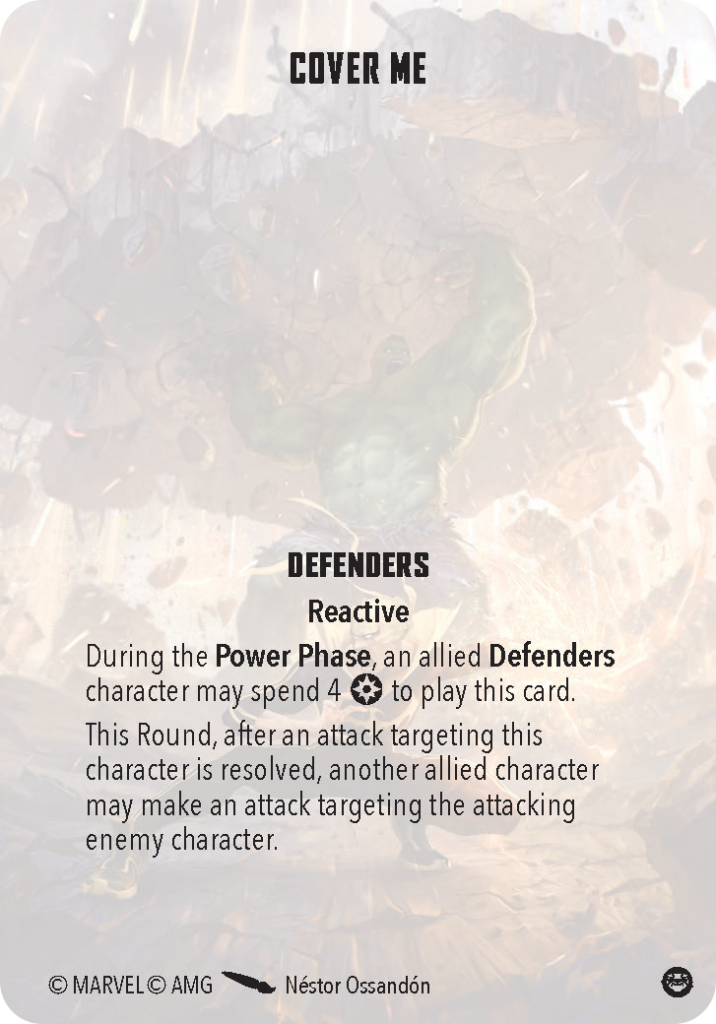 The first of our new Defenders specific cards. Cover Me allows one Defenders character to spend four power. After an attack is resolved against the character, another allied character may respond with an attack.