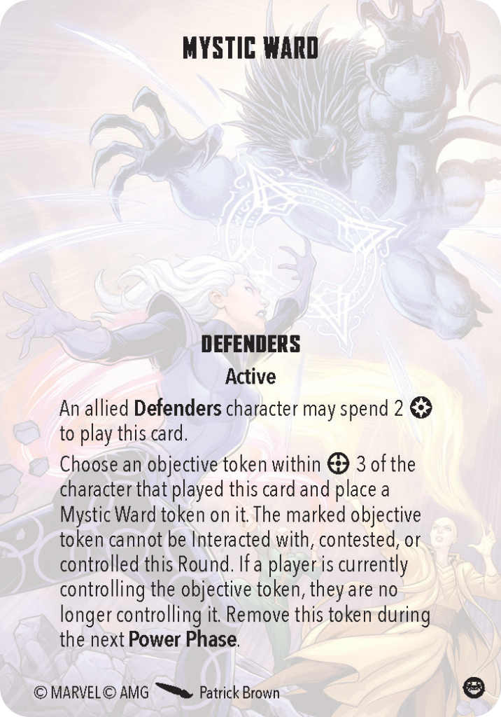 Mystic Ward offers Defenders the capacity to take one secure objective away from the opponent. You can also use it to stop an opponent from picking up an extract objective, but only if they haven’t picked it up yet. To use the card, your Defenders model must be within range three of the objective and have two power to spend.