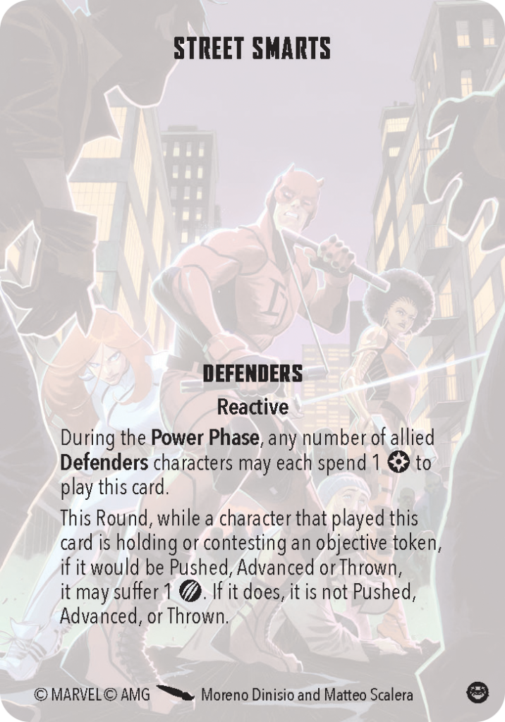 Street Smarts is the final card. Any number of Defenders characters can spend one power. For the rest of the round, if a character who spent one power would be pushed, advanced, or thrown, they can take one wound to stay where they are. While the prospect of taking wounds is certainly less than ideal, being able to stay on a secure objective or stop a big model (Hulk) from being thrown into a friendly model is phenomenal.