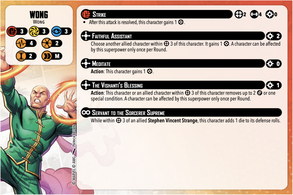 Meditate is solid. Wong can spend an action to give himself more power. If he’s sitting on a point and scoring without anyone to heal, consider meditating twice to power him up for later turns.