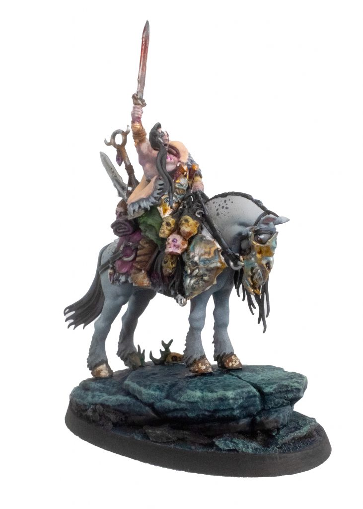 SRM: Contrary to Coach here, I built a few of them and wasn't wild about the process. They've each got a load of pieces and options which I like, but things like the horse heads each being three pieces makes for a somewhat tedious assembly process. The standard bearer is especially tough, since their icon is so top-heavy and connected to such a small shoulder. I glued the haft of it to one of the several severed heads hanging off this Fellrider, just to reinforce it and make that join stronger. I also noticed quite a few gaps on these models, especially where arms and legs met torsos. It's a shame because I adore the designs - the riders standing up in their stirrups give this unit some beautifully dynamic poses, and the whole crew is excellently detailed and ready to party. Building them is just kind of a pain.
