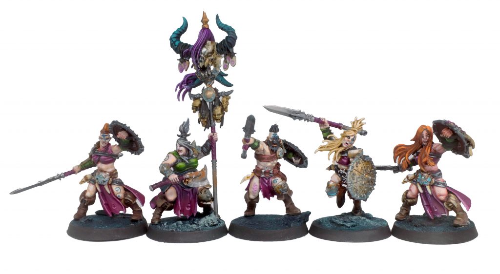 SRM: These are the models I was most excited for, and the ones who will (hopefully) be replacing the Chaos Marauders from Warhammer Fantasy now that those are old enough to drink. These sprues have more empty space than I'm used to, but are still chockablock full of options. You've got 5 dudes and 5 ladies in a set, with 2-3 unique heads for each, options for spears or hand weapons, command upgrades, and a dozen or so shields with different designs, any of which can be put on any model. I wish there was something more distinctive to pick out the champion like a cape or something, since he just looks like any other marauder save for a small hero rock. I gave him the ram skull shield (C13) to mark him out, since the rest of the shields tend to be pretty simple. If you managed to snag Tolgar Split-Eye at a previous GW event he'd make an excellent unit champion too, since he's a big more armored than these guys n' gals. You could easily use any of the shields or heads from the Darkoath Fellriders here too if you wanted more variety. The shields share the same connections, and some of the heads are close enough that they should fit with little effort. You could easily leave the shields off for subassembly purposes, but I wasn't doing that for 8 point models. My cutoff is 10 points,