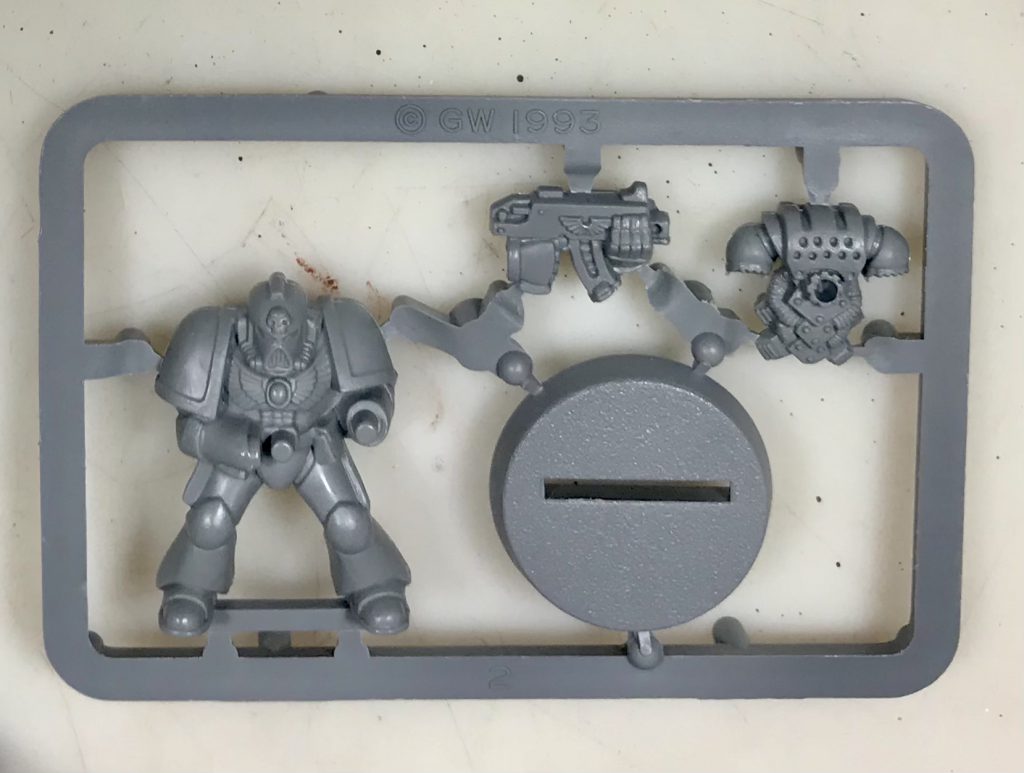 For the event he wanted everyone interested in participating to paint this monopose Space Marine from 1993: