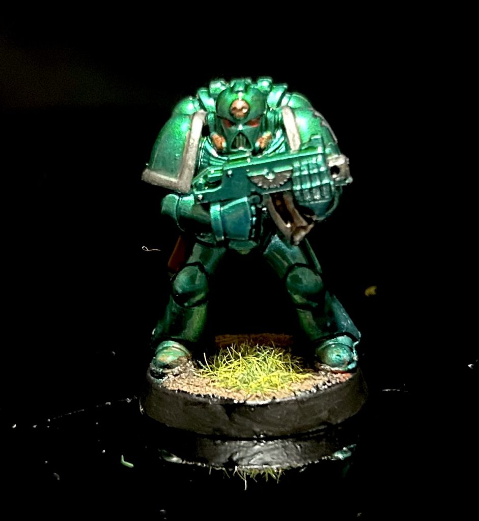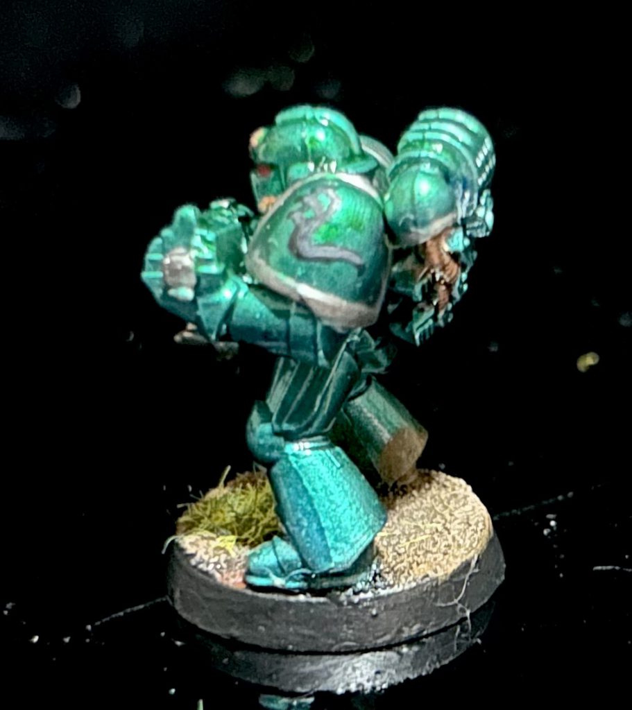I used the same process here that I used to paint 70 tactical marines of various sorts, plus 15 terminators, three dreadnoughts, three jetbikes and a half-dozen characters, all without wanting to kill myself. It’s all airbrush, baby. Prime, basecoat army painter Plate Mail Metal, zenithal coat army painter Shining Silver. All-over coat an 80/20 mix of Tamiya Clear Blue and Tamiya Clear Green, then do a zoot of pure Clear Blue from below and a zoot of pure Clear Green from above. Often I do a tiny dash of mixed shining silver/clear blue from directly above to pick out some highlights, but I forgot this time. Then it’s a clear blue glaze, then picking out details in Ironbreaker (well, Sir Coates Silver, the Two Thin Coats equivalent), eyes in red, some Balthasar Gold on the bronze details, wash the metal Nuln Oil and Agrax Earthshade respectively, and paint any other details you want (here, I did a holster in Mournfang Brown and Skrag Brown). I also picked out a little freehand hydra to be cheeky.