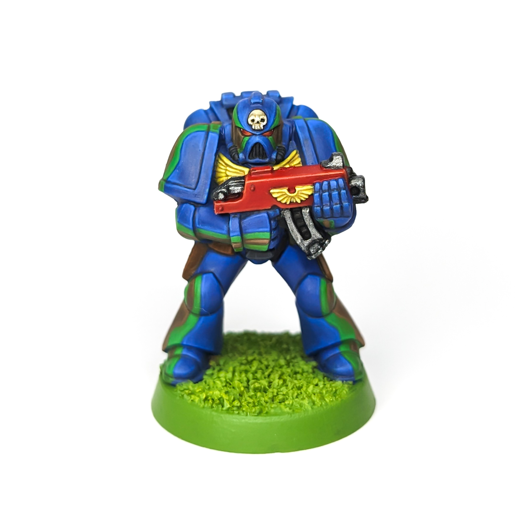 I always thought I would end up doing a quartered scheme for my marines - it's incredibly eye catching and a classic Space Marine look. The call of rainbows was too much, however. It is actually not as bad to paint a quartered scheme as you would think, it's just kind of like painting two smaller models. The blue is a 50/50 mix of Kantor Blue and Caledor Sky, highlighted with Hoeth Blue, Lothern Blue, and Blue Horror, while the red is the classic saturated red combo of Mephiston Red, highlighted with Evil Suns Scarlet, Wild Rider Red, and Troll Slayer Orange. This was also my first time painting a Goblin Green style base - kind of fun for the novelty and it actually really frames the model well. It took me about 5 tries to get the freehand on the chapter symbol even close to right, but I think it mostly reads.